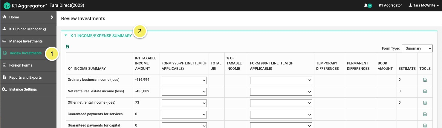 - Map your K-1 data to the 1040 lines on the 'K-1 Income/Expense Summary' section