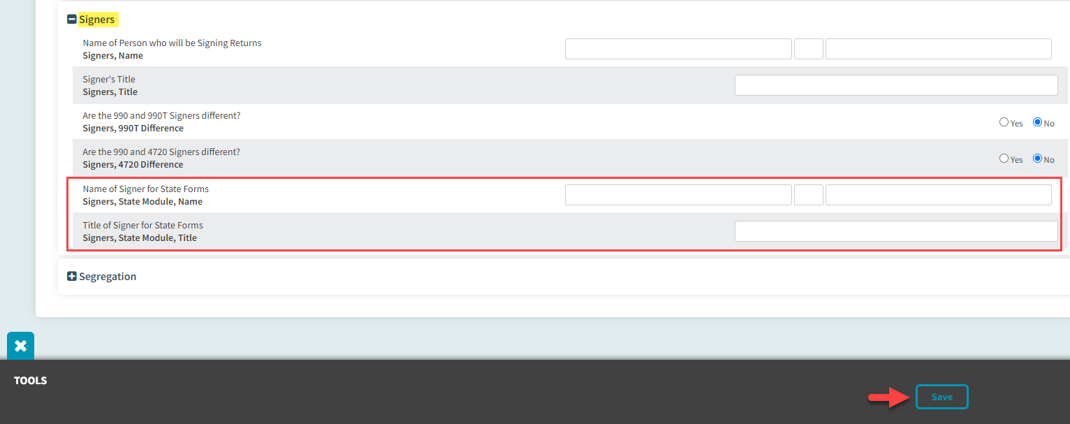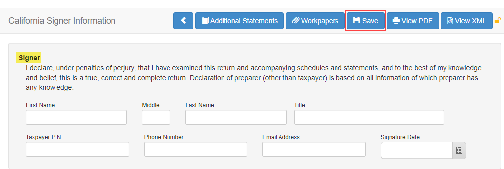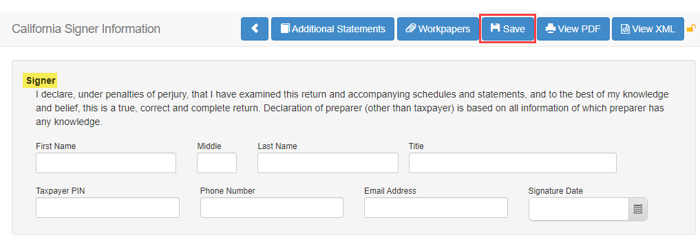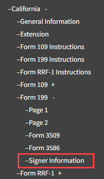 - Navigate to Basic Data -> General Information -> Signers section or the Form 199, California Signer Information page.