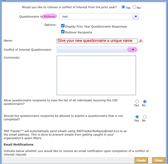 - Select the NEW questionnaire from the dropdown