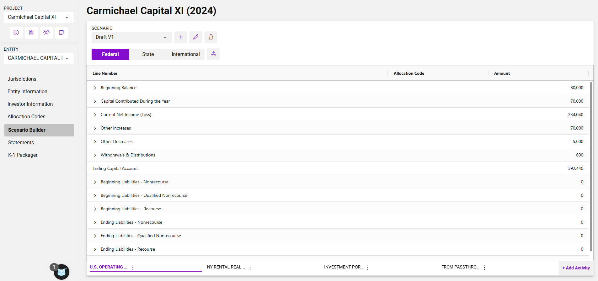 Events can now be grouped by activity, allowing users to break out items across business lines, types of income, or other categories. Right now, activity groupings are for tracking purposes onlyâamounts will be summed across activities when populating the Federal K-1 and overflow statements. A structured, system-generated schedule of activities will be added in a future release.
