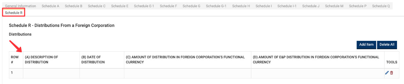Empty table rows in any Schedules/Parts, such as Schedule R shown below will cause form generation to fail.