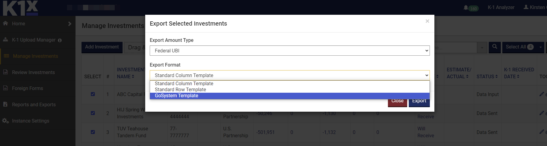 - Select desired Form 1065 investments and choose Export Selected Investment(s) from the dropdown next to Select All.