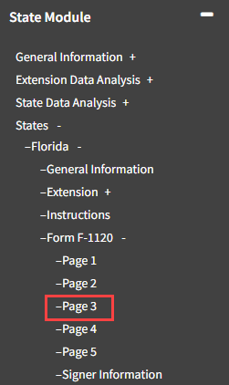 - Navigate to State Module -> States -> Florida -> Form F-1120 Page 3, Schedule II -> Line 12