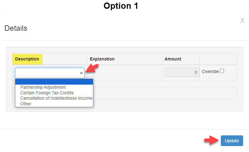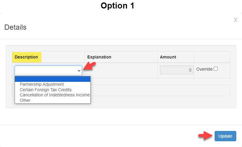 The element 'OtherSubtractionsDetails' in namespace 'http://www.irs.gov/efile' has invalid child element 'Amount' in namespace 'http://www.irs.gov/efile'. List of possible elements expected: 'SubDescription' in namespace 'http://www.irs.gov/efile'.