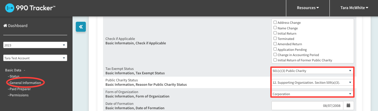 Form 990 Schedule A, Part I, Line 10, is selected based on the entity type assigned in the General Information section: There are additional options and inputs that affect the designations on Schedule A Part III.