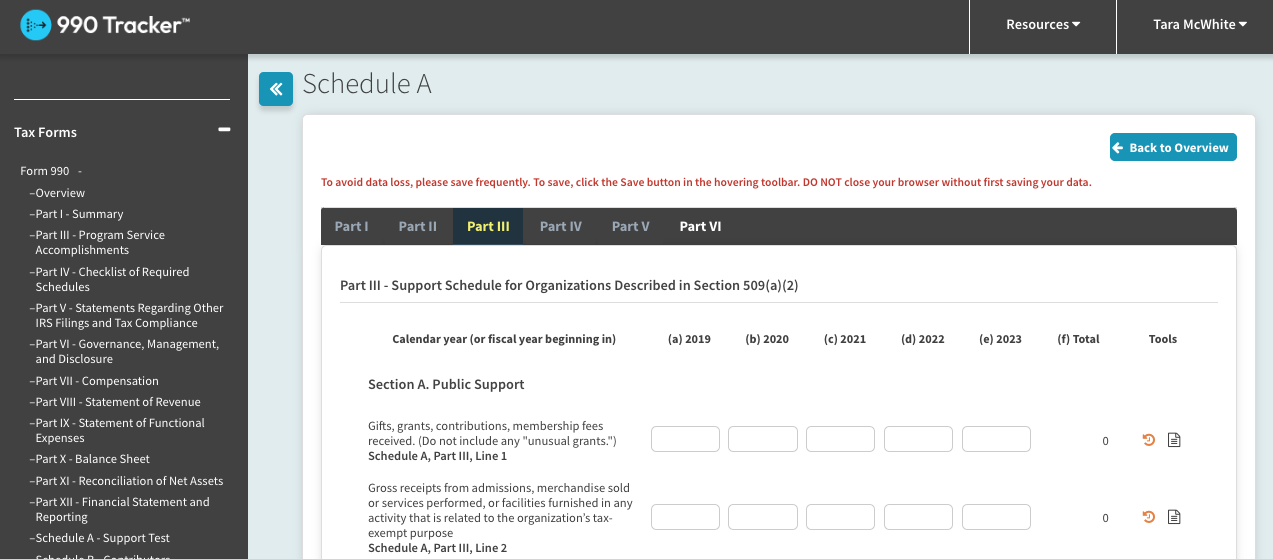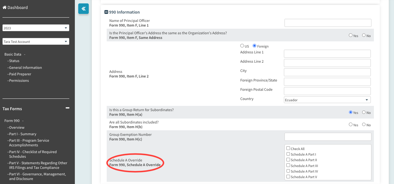The Schedule A Parts opened by default depend on your tax-exempt status and entity type set in the General Information section, however you can overrirde the default and enable or disable Schedule A manually.