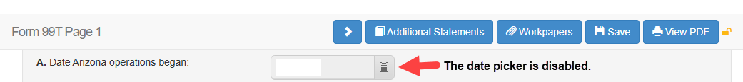 Issue: The client is unable to select / input a date for Date Arizona operations began: (Form 99T Page 1). The date picker is disabled.