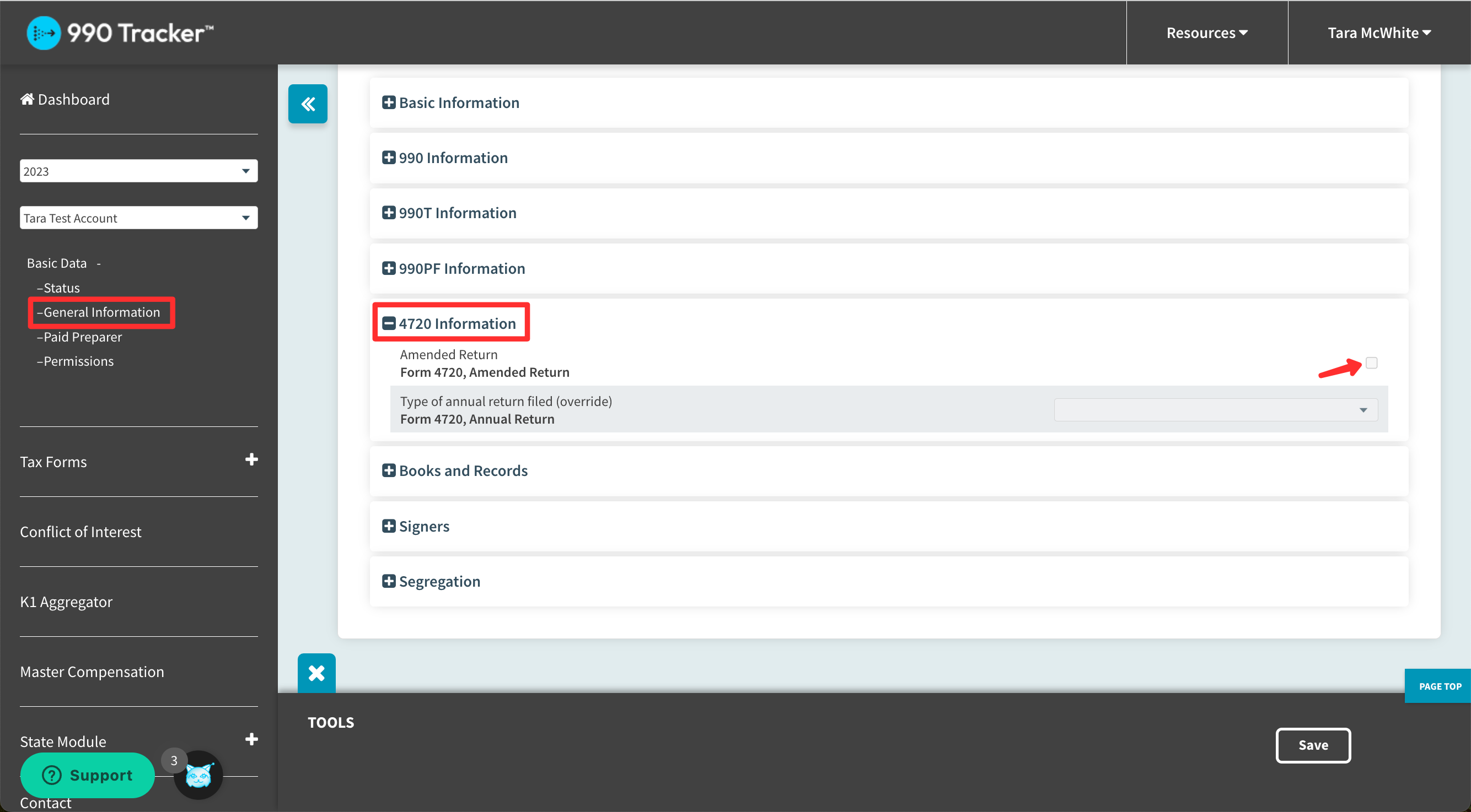 On the General Information page, in the '4720 Information' section, check the 'Amended Return' checkbox