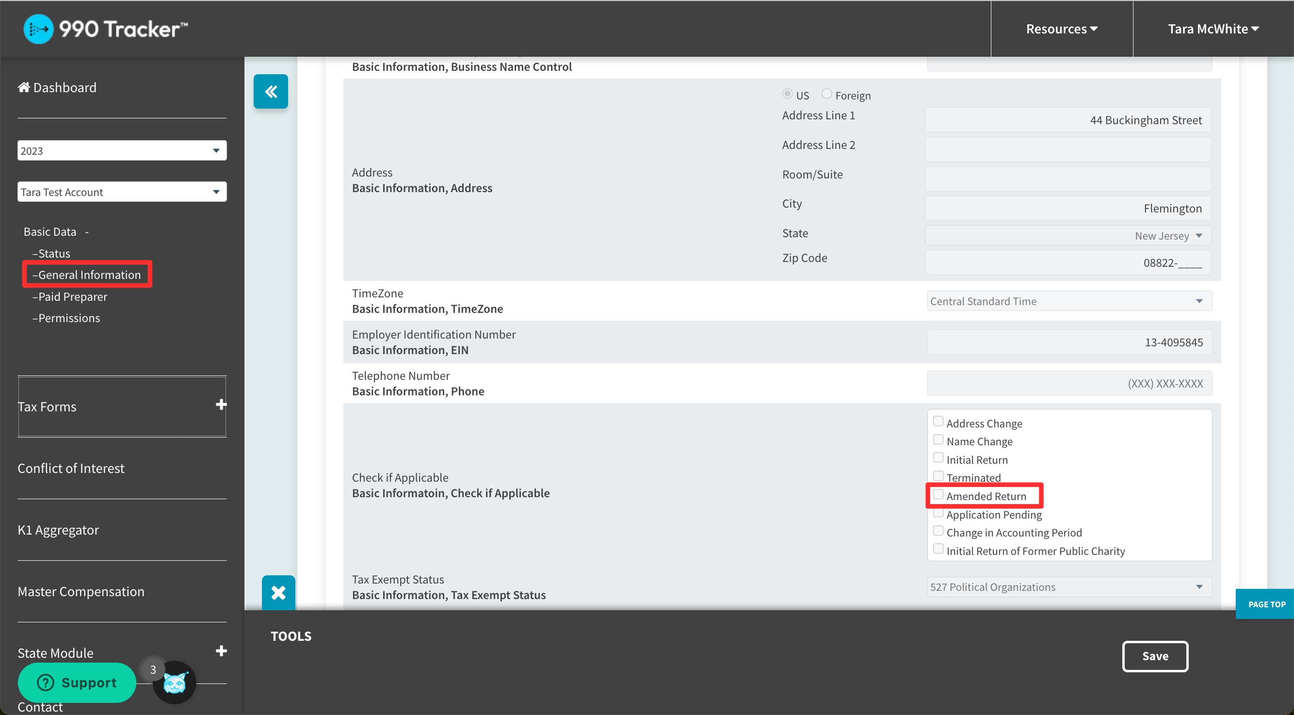 On the General Information page, in the 'Basic Information' section, check the 'Amended Return' checkbox