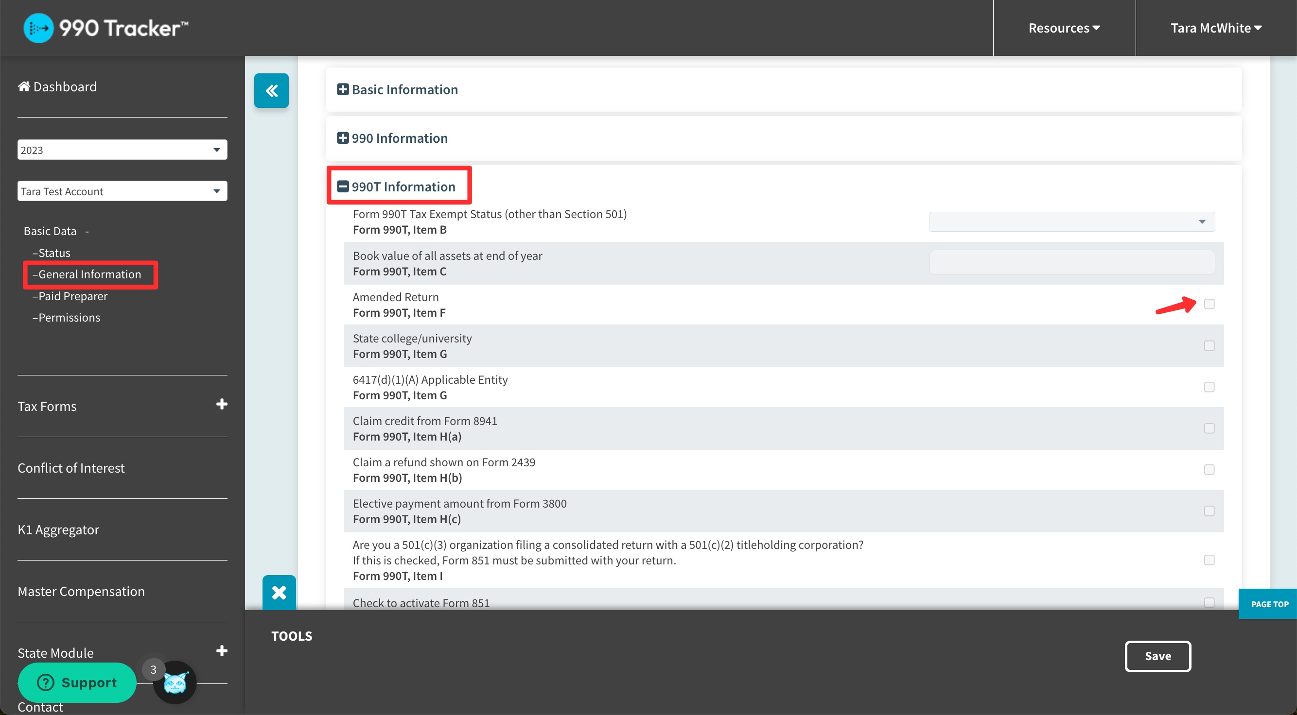 On the General Information page, in the '990T Information' section, check the 'Amended Return' checkbox