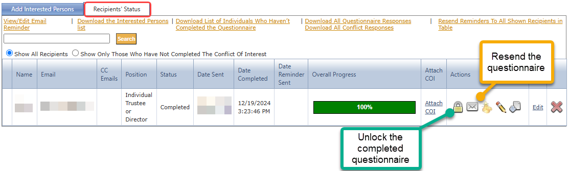 - Click on the envelope icon under the Actions column to resend the questionnaire