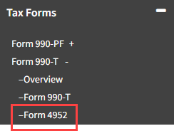 - Form 4952 is now active under Tax Forms -> Form 990-T.