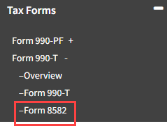 - Form 8582 is now active under Tax Forms -> Form 990-T.