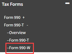 - Form 990-W is now active under Tax Forms -> Form 990-T.