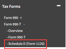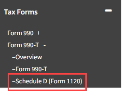 - Schedule D (Form 1120) is now active under Tax Forms -> Form 990-T.
