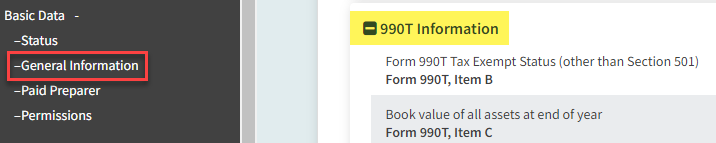 - Navigate to Basic Data -> General Information -> 990T Information.