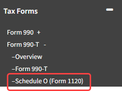 - Navigate to Form 990-T -> Schedule O (Form 1120) -> Part I, Line 3