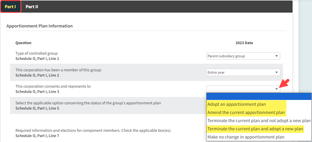 Navigate to Form 990-T -> Schedule O (Form 1120) -> Part I, Line 3 Choose one of the drop down options listed below: Adopt an apportionment plan Amend the current apportionment plan Terminate the current plan and.