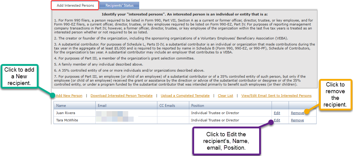 Resolution: The client can edit, add/remove the recipients in the Add Interested Persons tab.