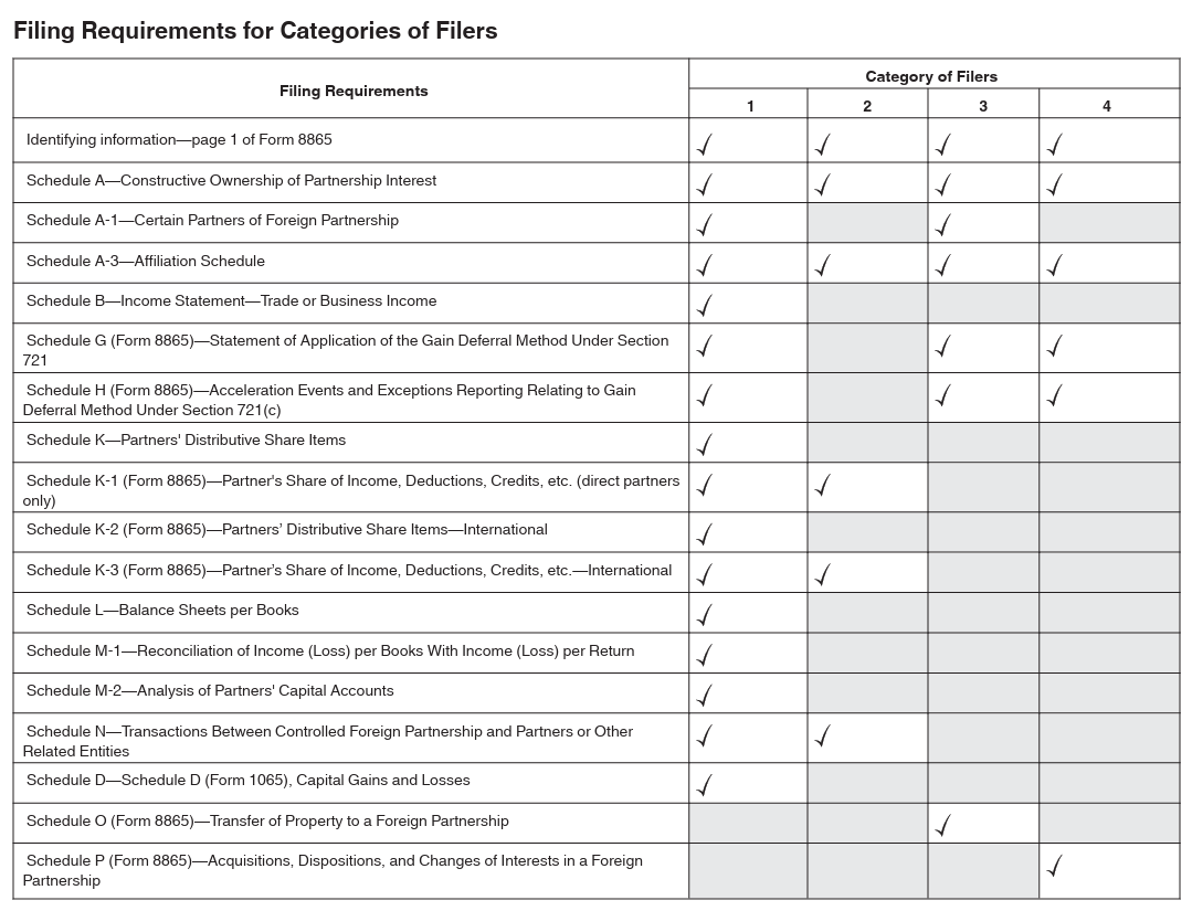 A U.S. person qualifying under one or more of the Categories of Filers (see below) must complete and file Form 8865. If you qualify under more than one category for a particular foreign partnership, you must submit all the items required for each category under which you qualify.