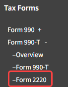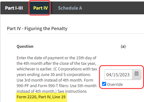 - Navigate to Tax Forms -> Form 990-T -> Form 2220 -> Part IV, Line 19