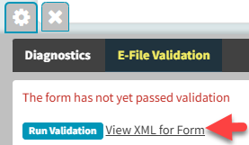 - Click on the "View XML for Form" link under the E-file Validation Tab