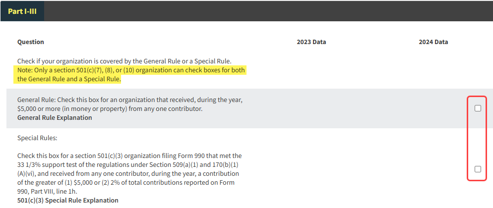 Issue: For organizations other than types, 501(c)(7), 501(c)(8), and 501(c)(10), IRS rules require that no more than one checkbox be selected between: General Rule and Special Rules.