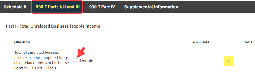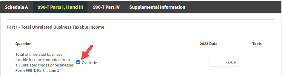 Issue: Form 990-T, Part I, Line 1 must be treated as zero if the amount on Schedule A, Part II, Line 18 is negative value. The client used the override feature in Form 990-T, Part I, Line 1 to input a negative value.