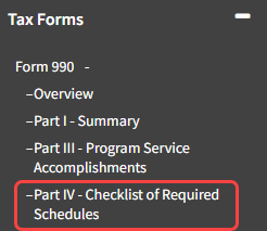 - Navigate to Tax Forms -> Form 990 -> Part IV -> Line 25b