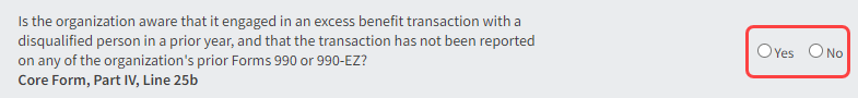Issue: The client did not make a selection for Form 990, Part IV, Line 25b