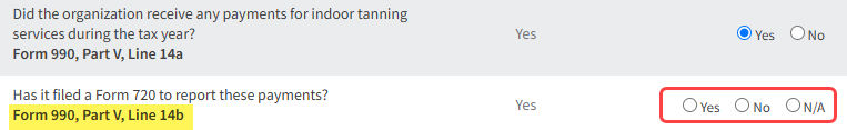 Issue: The client did not make a selection for Form 990, Part V, Line 14b
