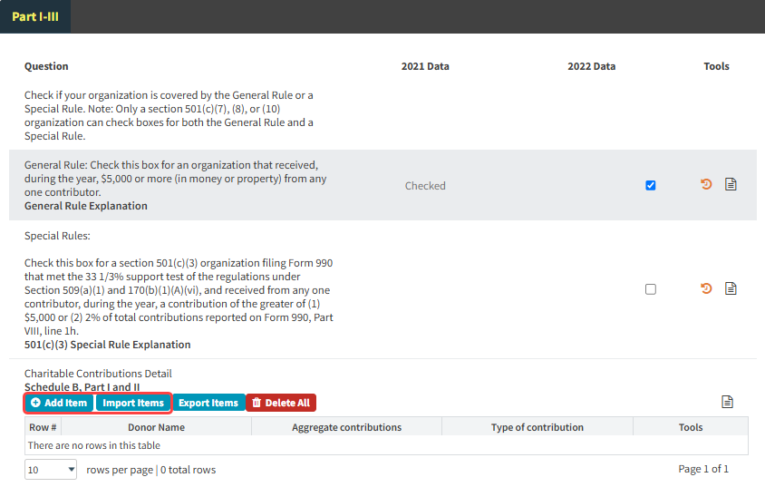 Issue: The checkbox for "General Rule" or "Special Rules" on Schedule B is selected, but no contributor information was included in the submission.