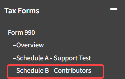 - Navigate to Tax Forms -. Form 990 -> Schedule B