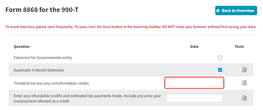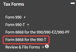 - Navigate to Tax Forms -> Form 8868 for the 990-T