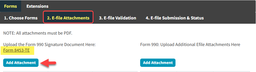 - Click "Choose File" and select the signed Form 8453-TE from your local machine.