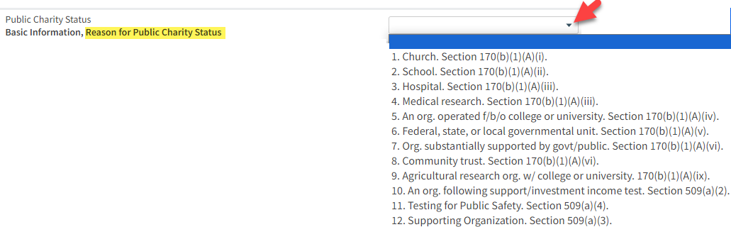- Click on the drop down menu to choose a Public Charity Status