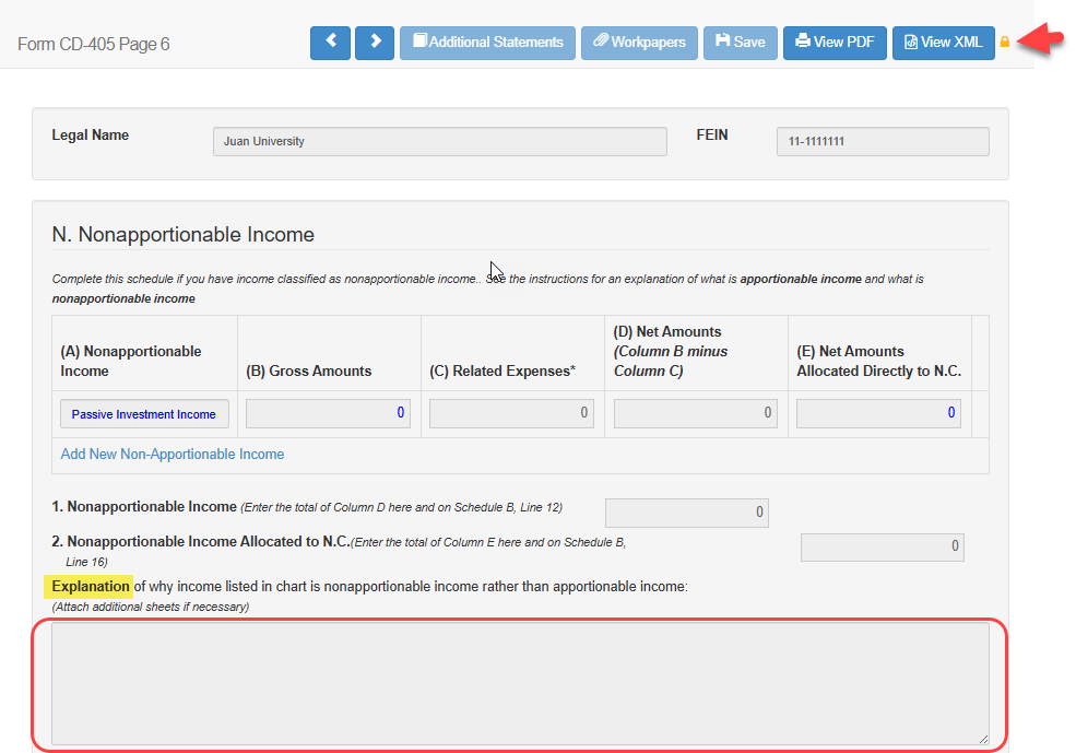 - Provide an explanation in the Schedule N, Explanation text field under Line 2