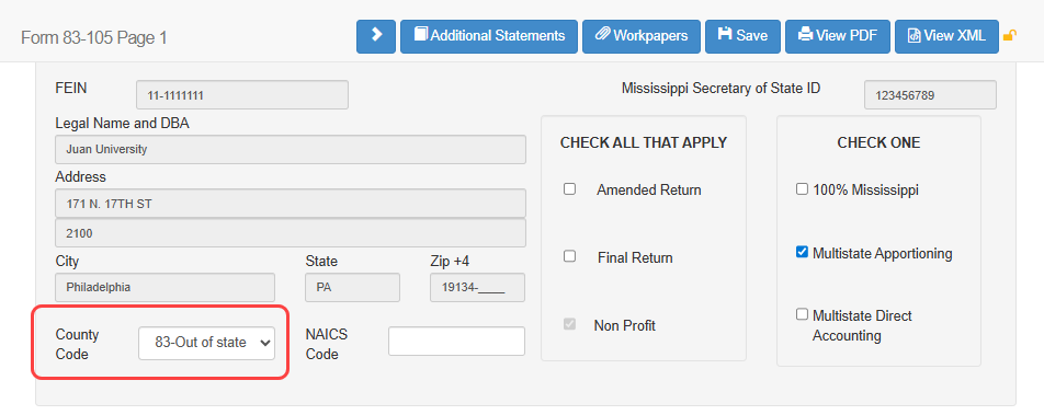 - Navigate to State Module -> States -> Mississippi -> Form 83-105 Page 1