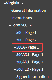 - Navigate to State Module -> States -> Virginia -> Form 500A Page 1 -> Section A - Apportionment Method.