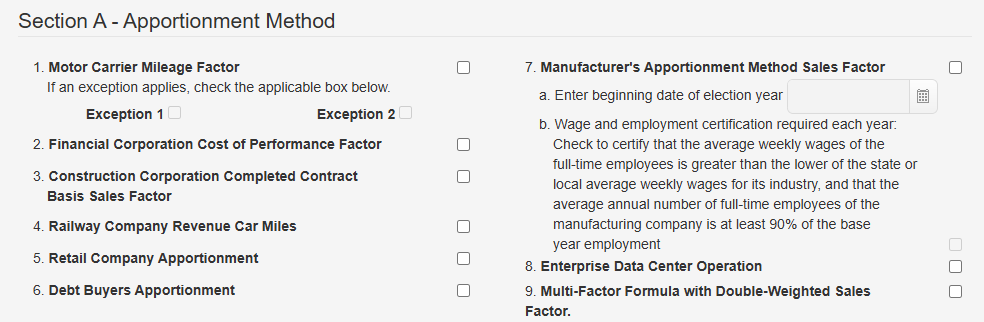 - Fill in the appropriate Apportionment Method.