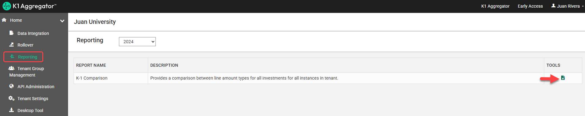 Answer: Via Export Selected Investments or the K-1 Comparison Report.