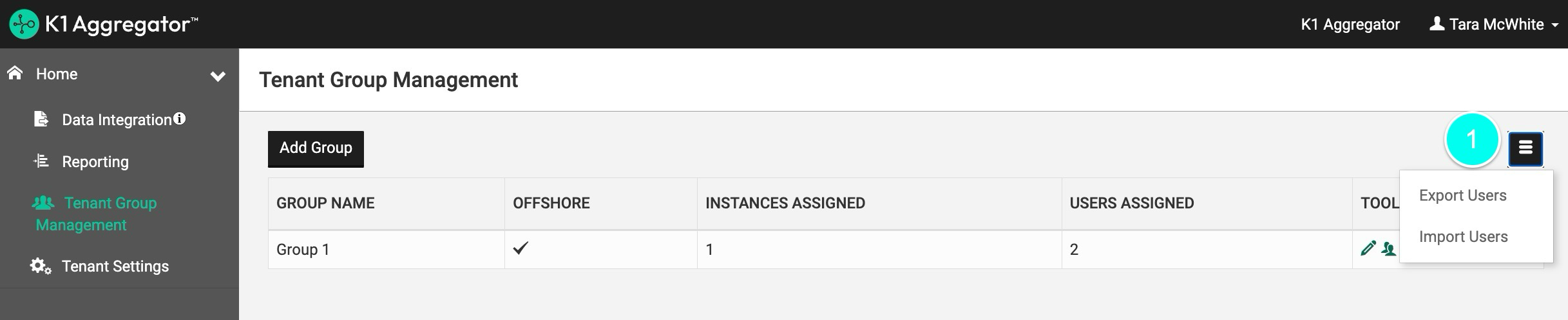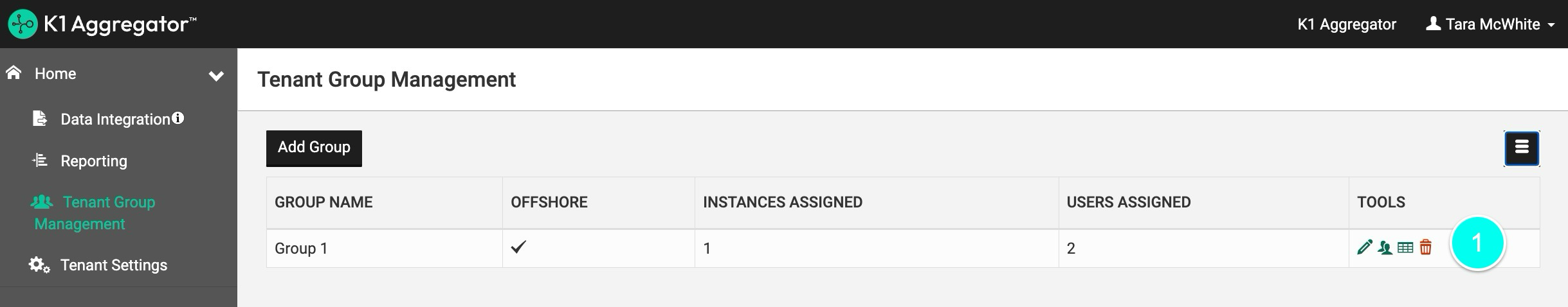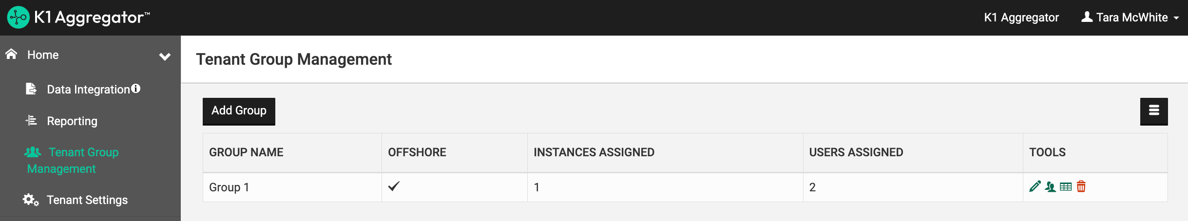 Once group management is enabled, administrators will have access to the Tenant Group Management page in K-1 Aggregator.
