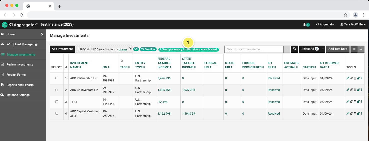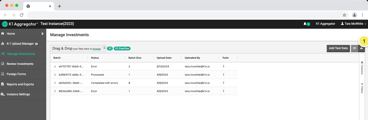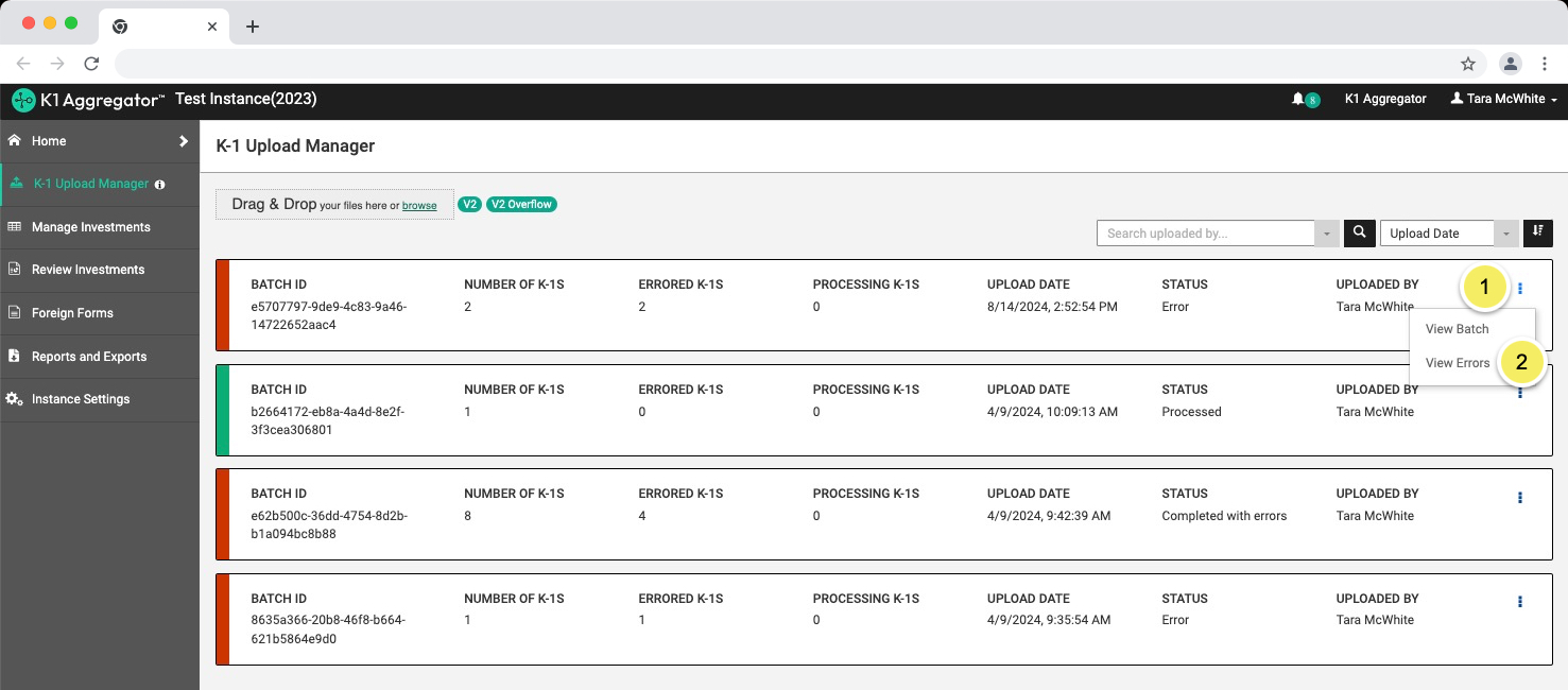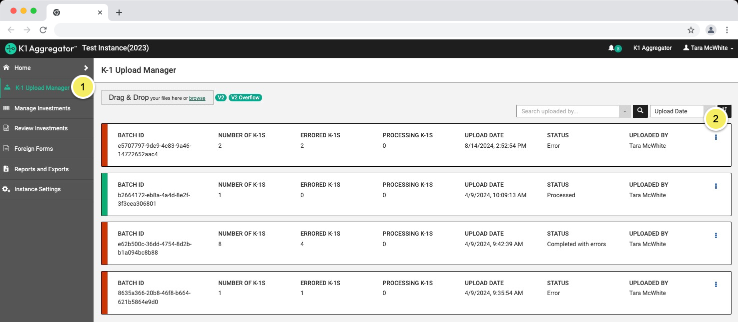 You can track the upload status either on the Manage Investments batch view or on the K-1 Upload Manager page