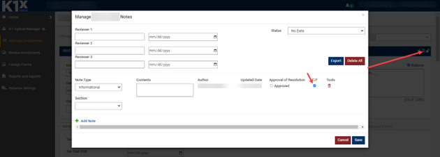 Where: Manage Investments → Investment Information panel → Manage Notes modal