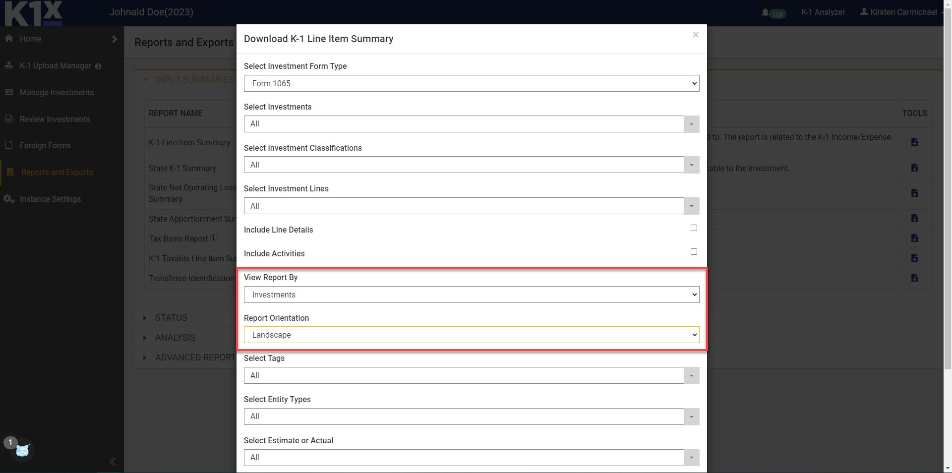- A new report format has been added to the K-1 Line Item Summary report to display investments in columns and line items in rows. It is available by choosing Investments from the View Report By dropdown and Landscape from the Report Orientation dropdown.