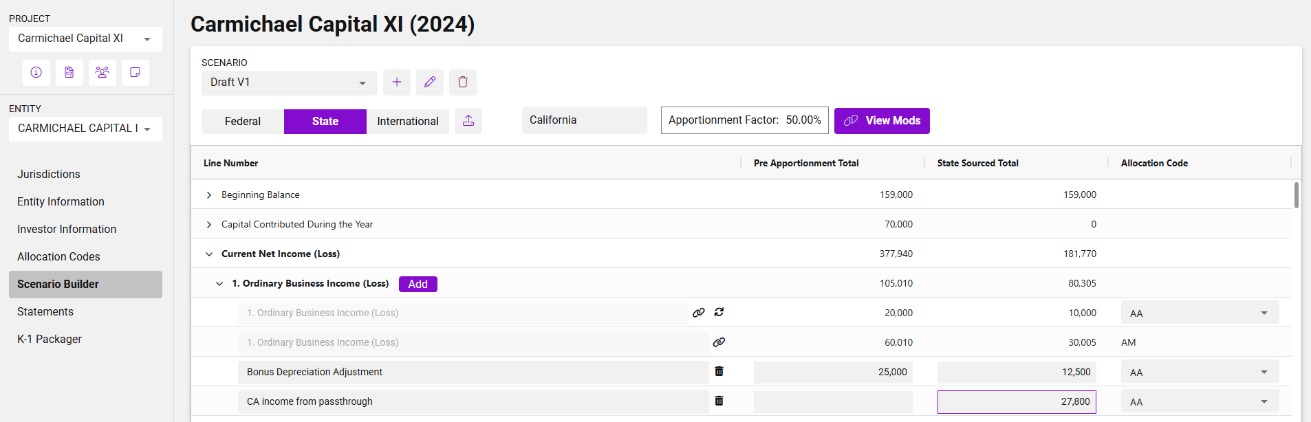 State-Sourced Total: Reflects the final amount that will be reported on the state K-1.