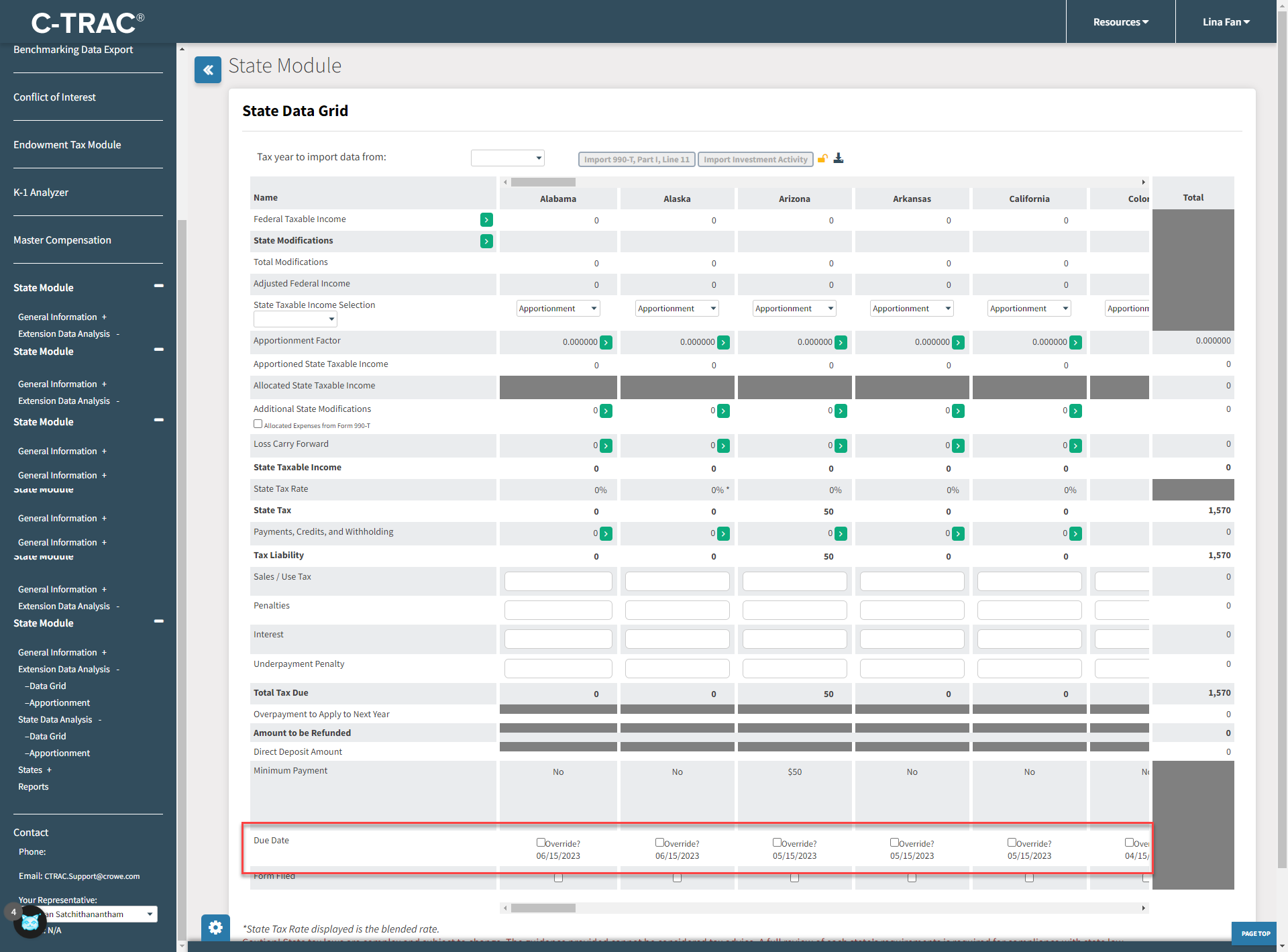 5. The override option to change the due date for your State Filing Instructions exists at the bottom of the State Data Grid. Selecting an override date will affect all the forms for that particular state.