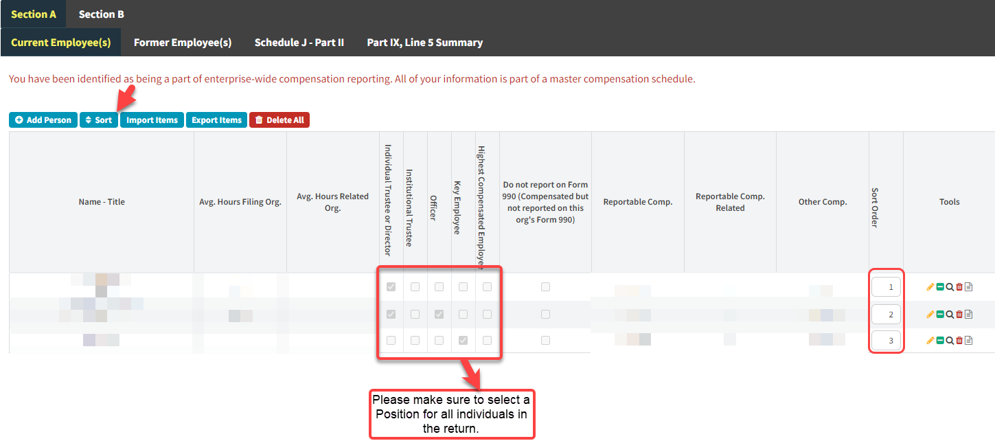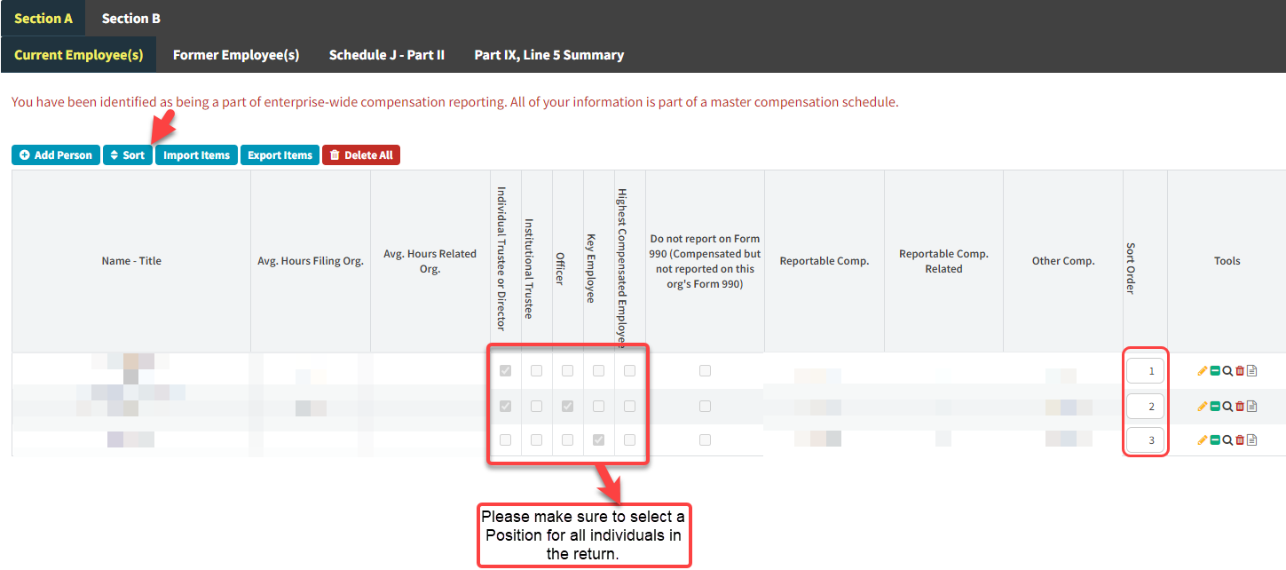 Users can manually sort any of the entries reported in Form 990, Part VII. To the far right of each record, there is a "sort order" field. A user can assign the numbering order that they want the records to appear in, and then click "sort" at the top of the table. This will rearrange the ordering as the user has dictated to the system. Remember to save after using the "sort" feature.