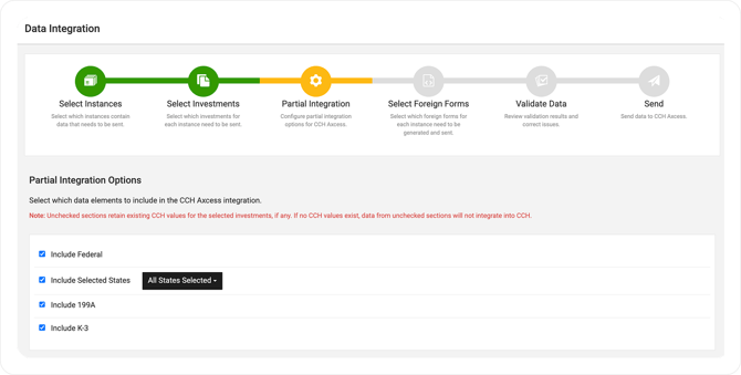 All available data for the selected investments will be sent to CCH, consistent with standard integration behavior.