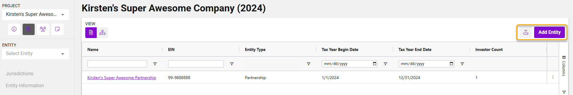 Navigate to the Project Entities page to enter the list of entities included in the project. You can: